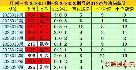 开奖回顾:排列三第2026020期奖号为:095韦德体育官网,类型为组六,号码012路比为2:0:1,百十个位号码直选分别遗漏8期、1期和3期。