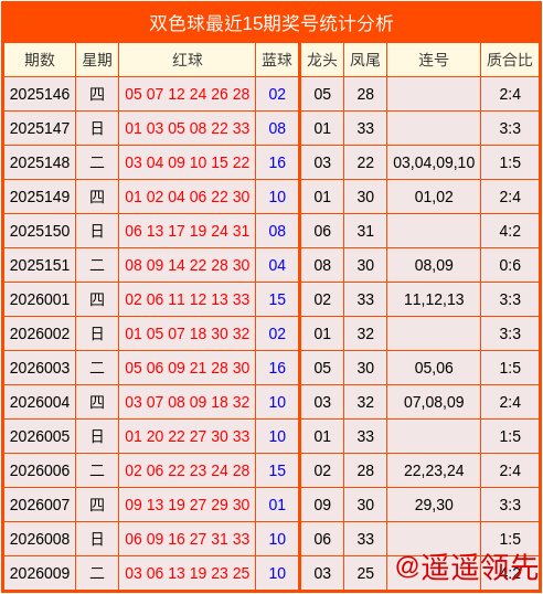 龙头分析:最近15期龙头号码中,质合比为11:4,质数表现较为火热,合数表现较为冷淡。上期红球龙头号码开出03,为质数。本期参考龙头号码为质数:01。