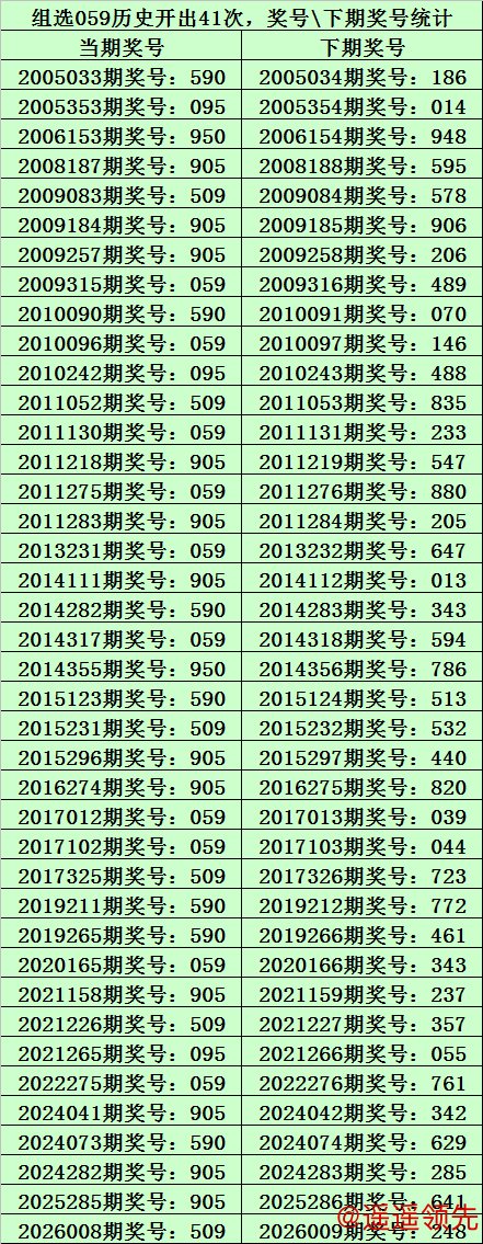 二、组选059分析:排列三历史上已开出41次组选号码059了,其奖号和下期开出奖号统计如下:
